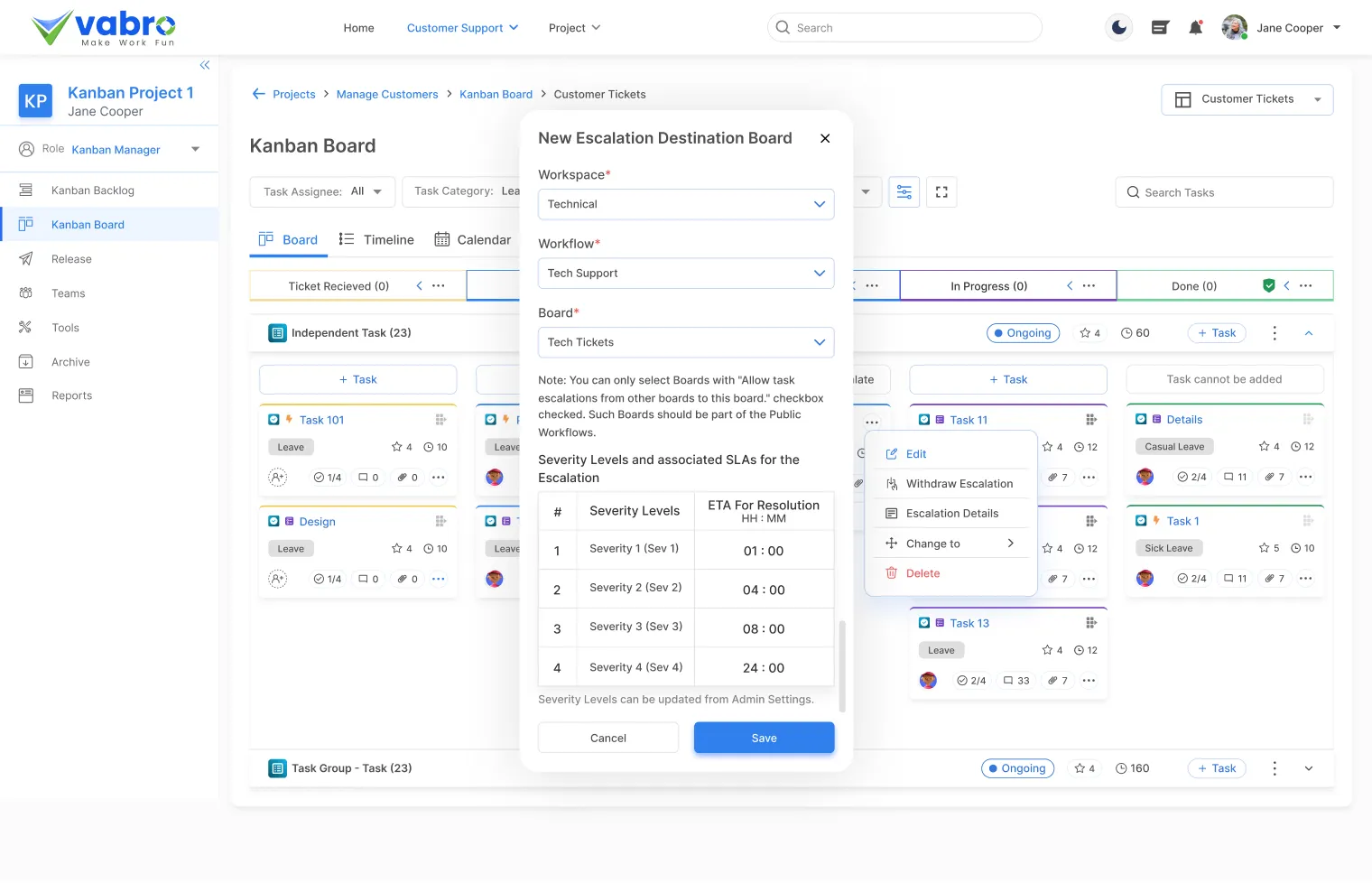 in Vabro task escalation rules automate the flagging and escalation of at-risk tasks based on set criteria like time or priority. This ensures timely attention to critical tasks, prevents delays, and keeps projects on track.