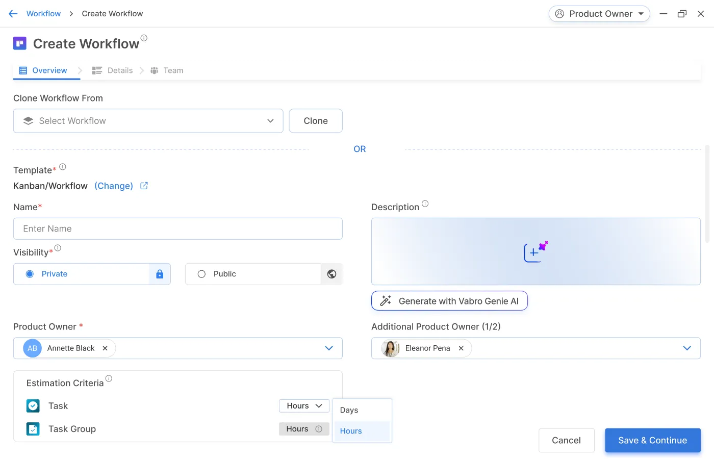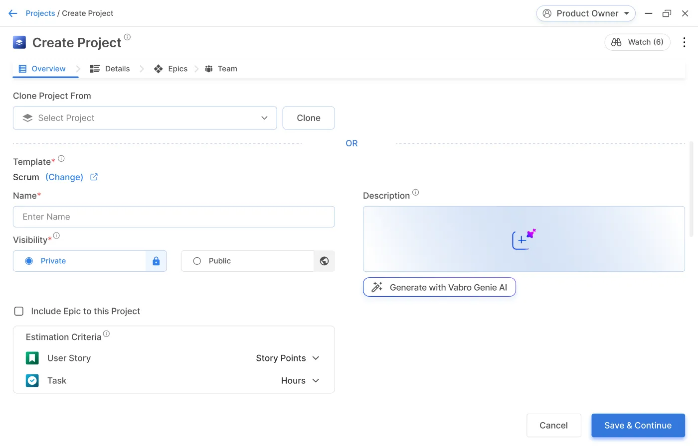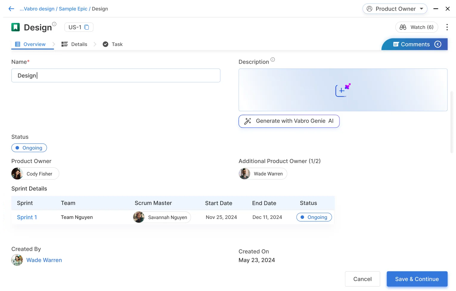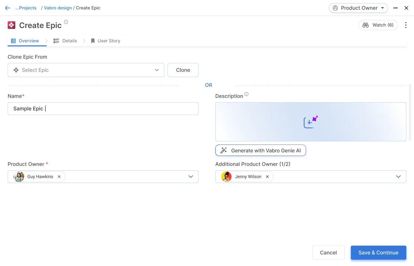 Vabro simplifies user story creation with intuitive templates and AI-assisted suggestions , ensuring clarity and consistency. Teams can link stories to epics, assign ownership, and set acceptance criteria, making backlog management seamless and structured.