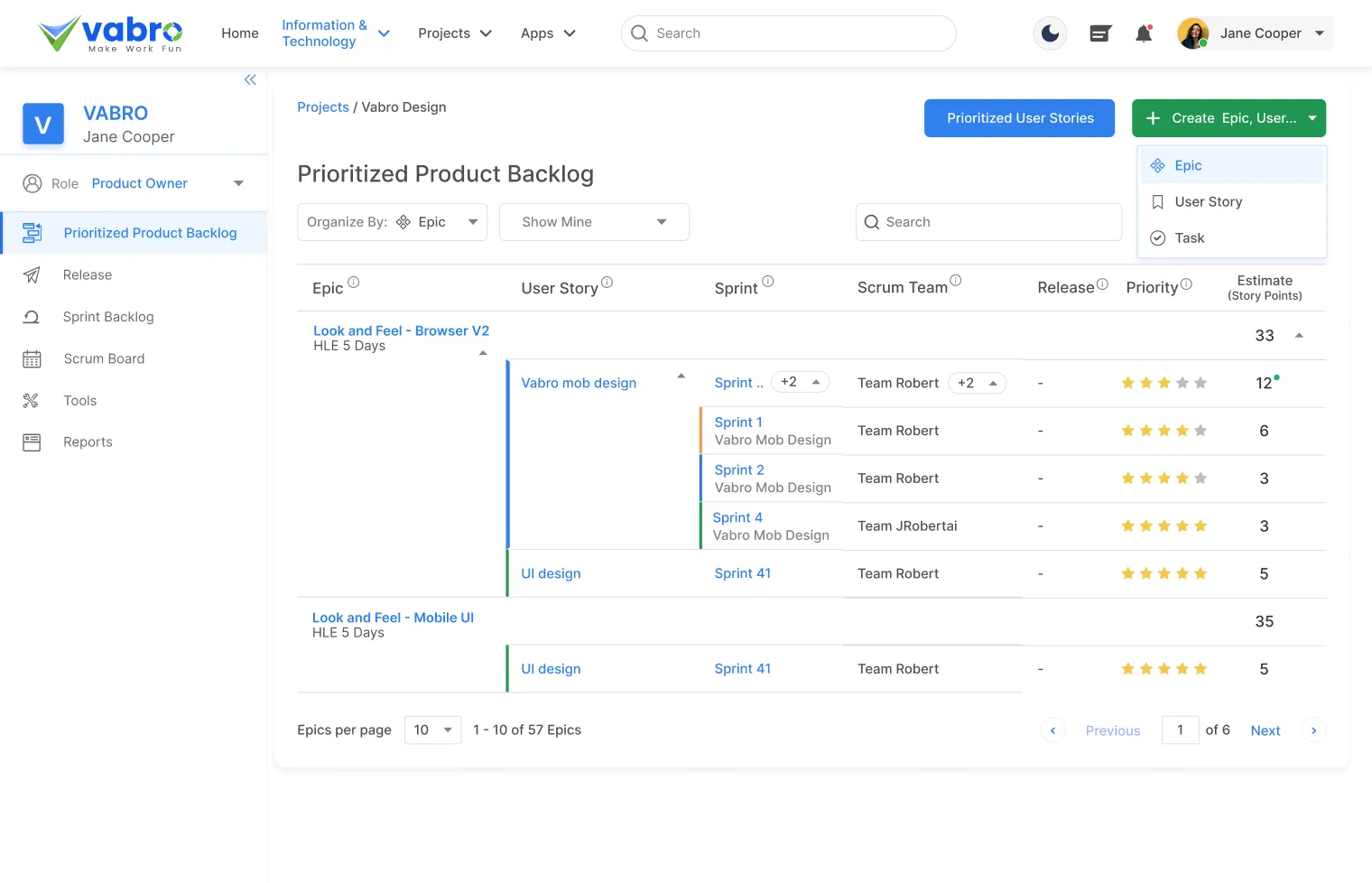 Vabro enables seamless Epic creation , allowing teams to group related tasks and user stories under a larger objective. With customizable workflows, priority settings, and progress tracking teams can efficiently manage complex projects while ensuring alignment with business goals.