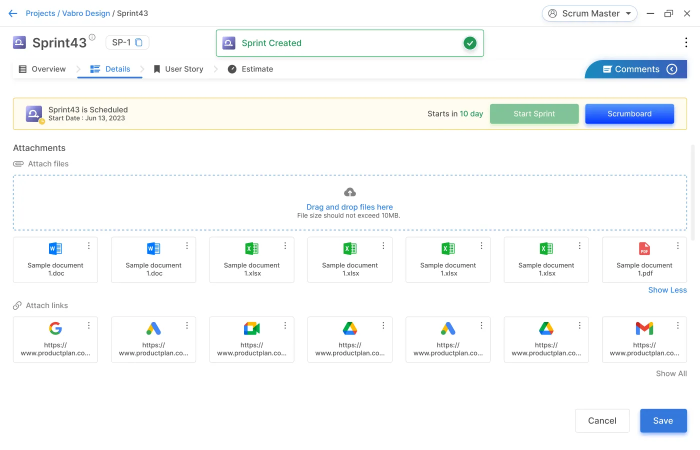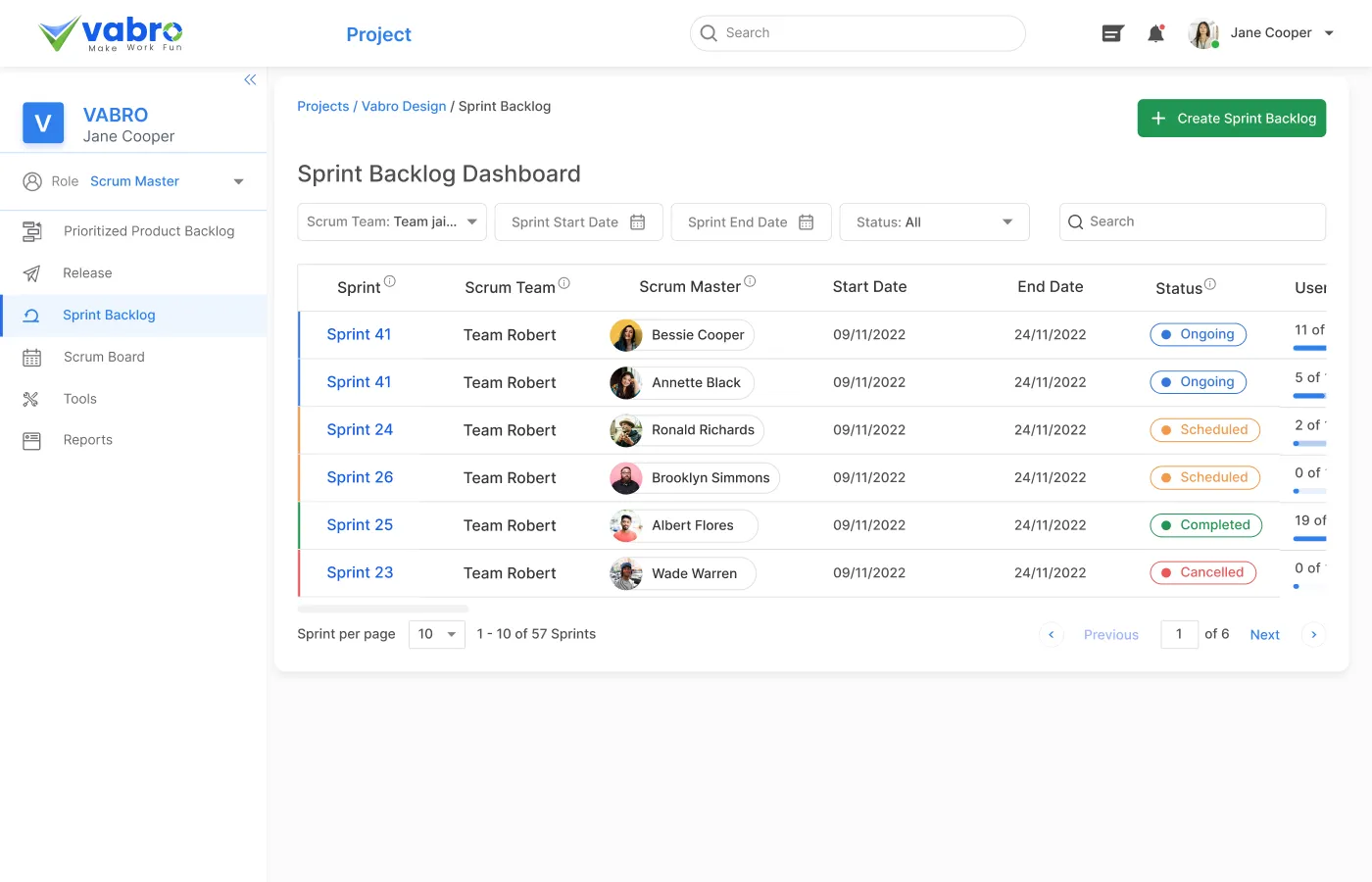in Vabro Starts Sprint is the action that officially initiates a sprint cycle. Once the sprint is started, the tasks or user stories from the Sprint Backlog become active, and team members begin working on them. This feature helps teams track sprint progress and ensures the start of the time-boxed period for focused work, facilitating structured delivery and clear timelines.