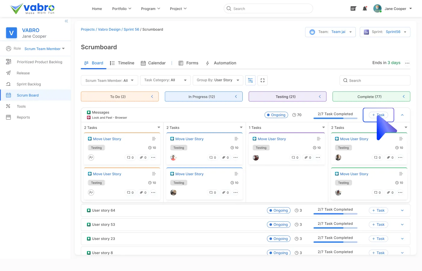 Vabro streamlines backlog management by allowing teams to organize, refine, and rank tasks based on business value, effort, and dependencies . With smart filtering, drag-and-drop adjustments, and real-time collaboration, teams ensure that the most impactful features are addressed first.