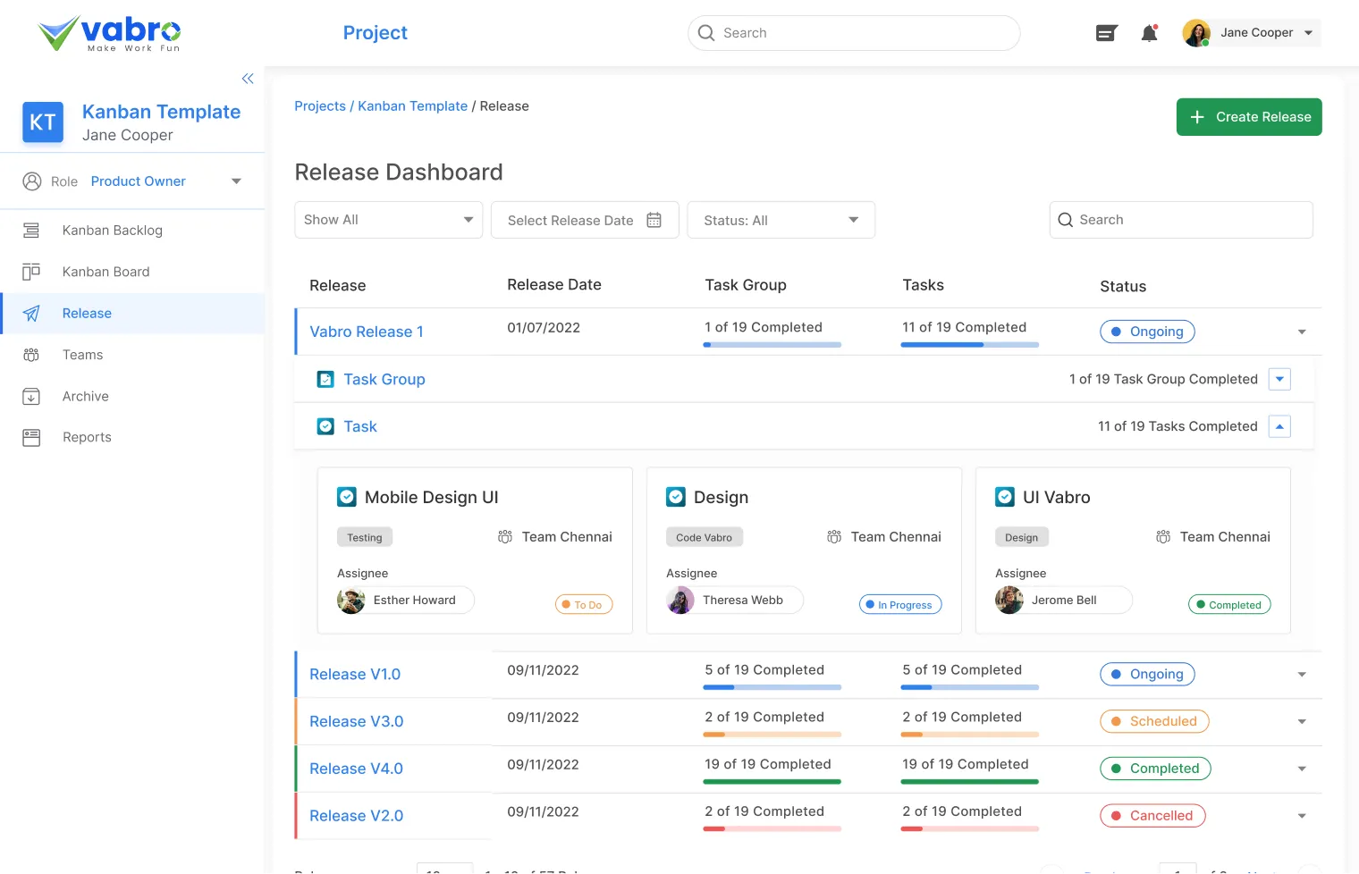 Vabro streamlines Kanban release management with a Visual Workflow , drag-and-drop task movement, and real-time analytics. Automated notifications and tool integrations ensure smooth deployments, while insights on cycle time and bottlenecks help teams optimize efficiency.