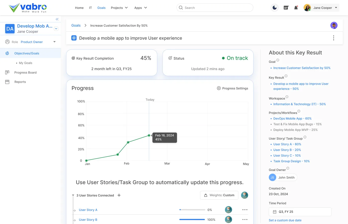 Setting up OKRs in Vabro helps teams define clear Objectives and Key Results to align goals, track progress, and drive performance. Users can set objectives, assign measurable key results, and monitor outcomes in real time, ensuring strategic alignment and accountability.