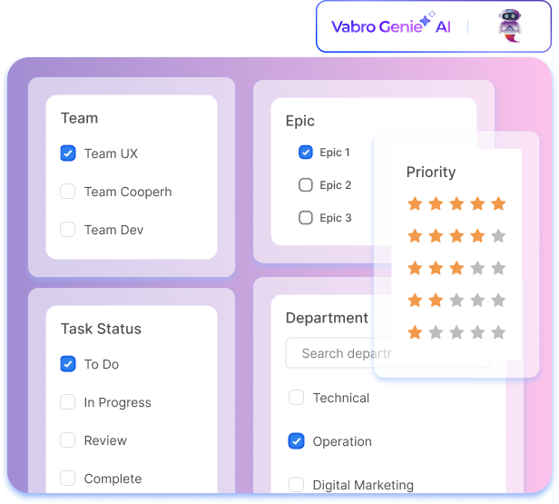 Effortlessly arrange your columns to sort tasks into groups that align with your workflow stages or project categories. Tailor Boards by status, assignee, priorities, and more to improve your organization. No need to start from scratch! Generated by Vabro Genie AI and crafted with inputs from customer service experts, comprehensive Vabro Templates include: