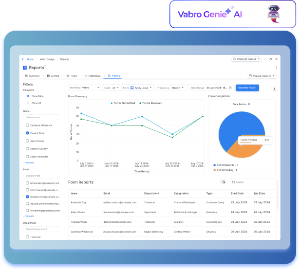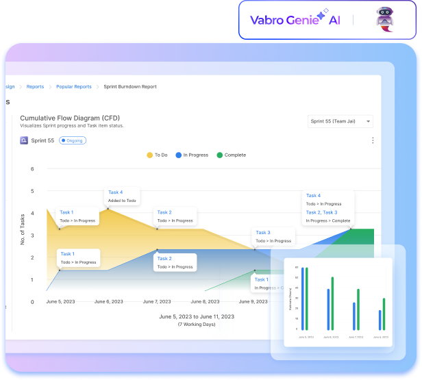 Vabro Genie AI, the Artificial Intelligence engine powering Vabro, is seamlessly integrated across the platform and all subscriptions. It enhances team productivity by identifying improvement opportunities, streamlining collaboration, and minimizing unnecessary documentation