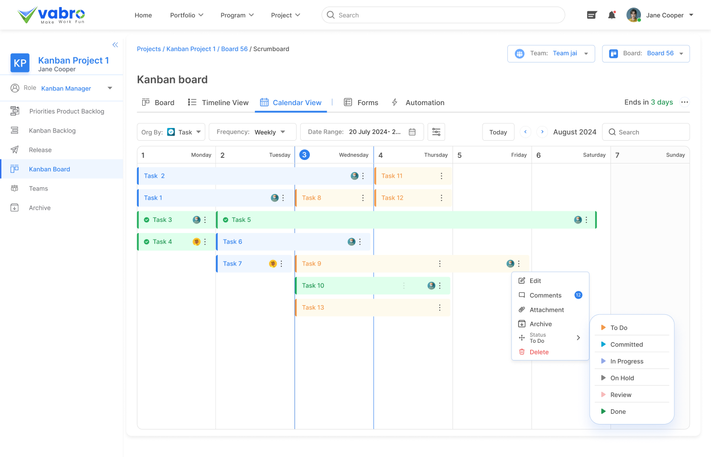 Oversee Kanban Boards and Backlogs to ensure smooth and organized workflows. Kanban Managers can set WIP limits,